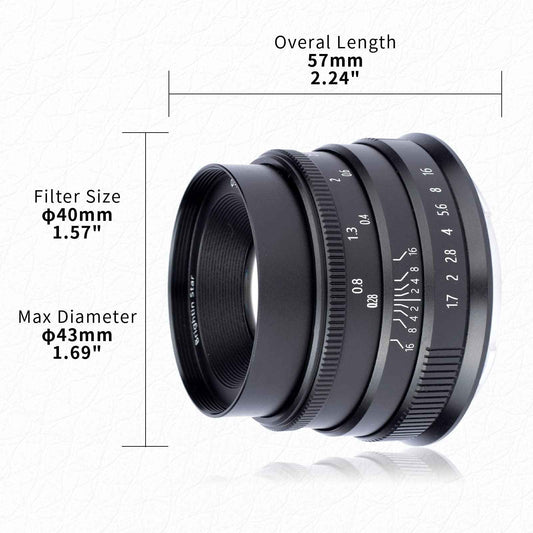 Brightin Star | APS-CSize & Weight: 64*63mm, 395gMount: Canon ER-M, Sony E, M4/3, Fujifilm X, Canon RFScene: Travel, Portrait, Food, PetAperture Control: Equipped with a stepped aperture for flexible depth of field and exposure adjustment based on shooting needs. The exterior design has been upgraded for a better user experience.[Attention Please] To ensure you have the best experience, please READ and UNDERSTAND the information below before purchasing. Please note that this Brightin Star camera lens is designed for Mirrorless Cameras only, and is NOT compatible with SLR cameras.