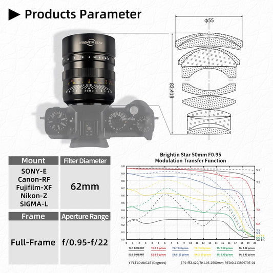 [F0.95 Large Aperture&Full-Frame]- Brightin-Star 50mm F0.95 has an industry-leading f/0.95 Aperture Full-Frame, creating perfect bokeh effects, while ensuring that more light can still be obtained in night scenes and dim environments.