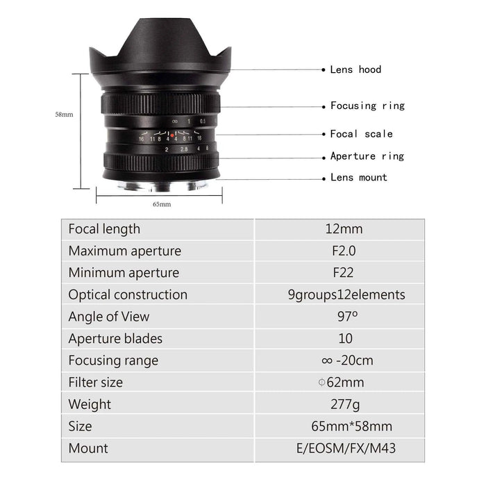 Brightin Star 12mm F2.0 Ultra Wide-Angle Big Aperture APS-C Manual Focus Mirrorless Cameras Lens
