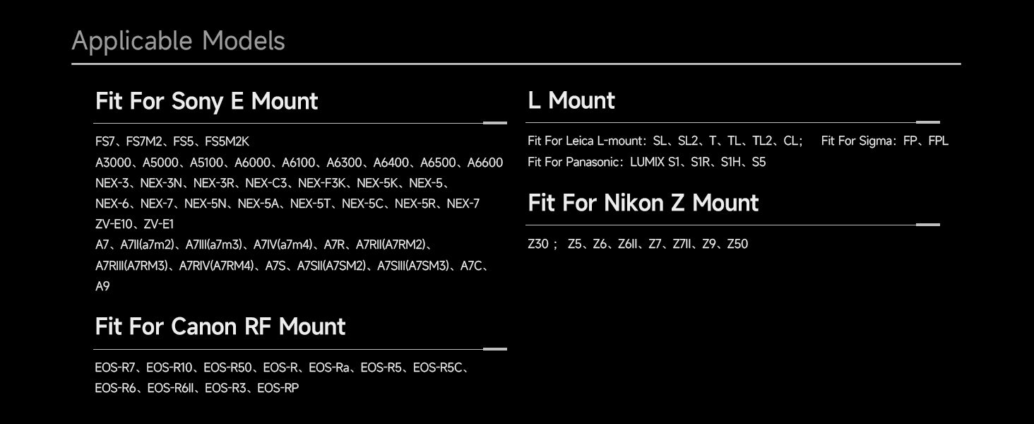 Fit Sony E Mount Lenses£ºFS7¡¢FS7M2¡¢FS5¡¢FS5M2K¡¢A3000¡¢A5000¡¢A5100¡¢A6000¡¢A6100¡¢A6300¡¢A6400¡¢A6500¡¢A6600¡¢NEX-3¡¢NEX-3N¡¢NEX-3R¡¢NEX-C3¡¢NEX-F3K¡¢NEX-5K¡¢NEX-5¡¢NEX-6¡¢NEX-7¡¢NEX-5N¡¢NEX-5A¡¢NEX-5T¡¢NEX-5C¡¢NEX-5R¡¢NEX-7 ZV-E10¡¢ZV-E1¡¢A7¡¢A7I(a7m2)¡¢A7I(a7m3)¡¢A7IV(a7m4)¡¢A7R¡¢A7RII(A7RM2)¡¢A7RII(A7RM3)¡¢A7RIV(A7RM4)¡¢A7S¡¢A7SII(A7SM2)¡¢A7SII(A7SM3)¡¢A7C¡¢A9