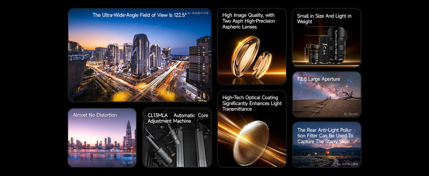 Brightin Star | Full Frame LensSize, weight: 70*96.6mm, 550gMount: Canon RF, Nikon Z, Sony mount, L mountScene: Starry Sky, Landscape, ArchitectureCapture stunning 122.5¡ã ultra-wide views with F2.8 low-light clarity, minimal distortion, and a lightweight, portable design