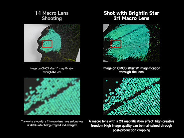 [2:1 Double Macro Lens] Brightin Star 60mm F2.8 macro lens has an excellent 2:1 magnification, the imaging effect is twice the actual, APS-C format lens, the equivalent focal length is 90mm, shooting When shooting insects and other inaccessible objects, there is a safe enough shooting distance, and more real details can be displayed at the same time.