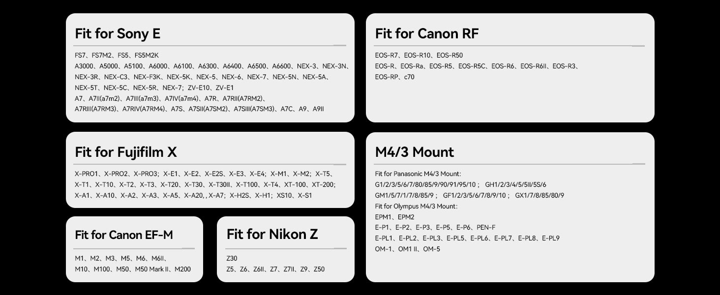 [Compatible Information] Fit for Sony E-Mount FS7, FS7M2, FS5, FS5M2KA7, A7II, A7R, A7RII, A7S, A7SII, A7III, A7RIII, A7R4, A7S3, A3000, A6500, A6300, A6400, A6000, A5100, A5000, A6600, NEX-3, NEX-3N, NEX-3R, NEX-C3, NEX-F3K, NEX-5K, NEX-5, NEX-6, NEX-7, NEX-5N, NEX-5A, NEX-5T, NEX-5C, NEX-5R.