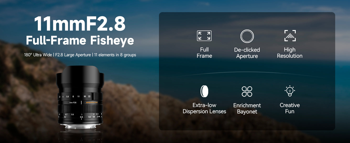 [Ultra-wide-angle fisheye lens]-Brightin-Star 11mm F2.8 has an extraordinary 180?? viewing angle and ultra-wide field of view, making it more shocking to shoot buildings, starry skies, and the Milky Way, with a full sense of space.