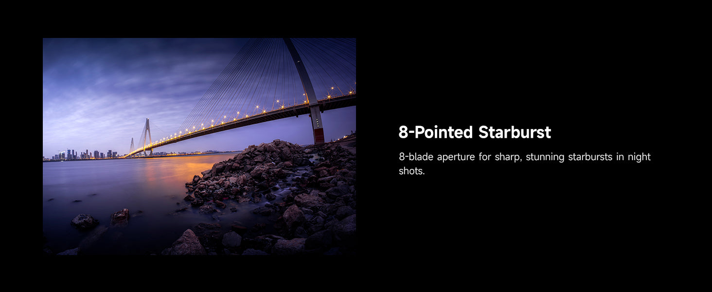 8-Point Starburst Effect::Features an 8-blade aperture diaphragm, producing a brilliant 8-point starburst effect when shooting night scenes.