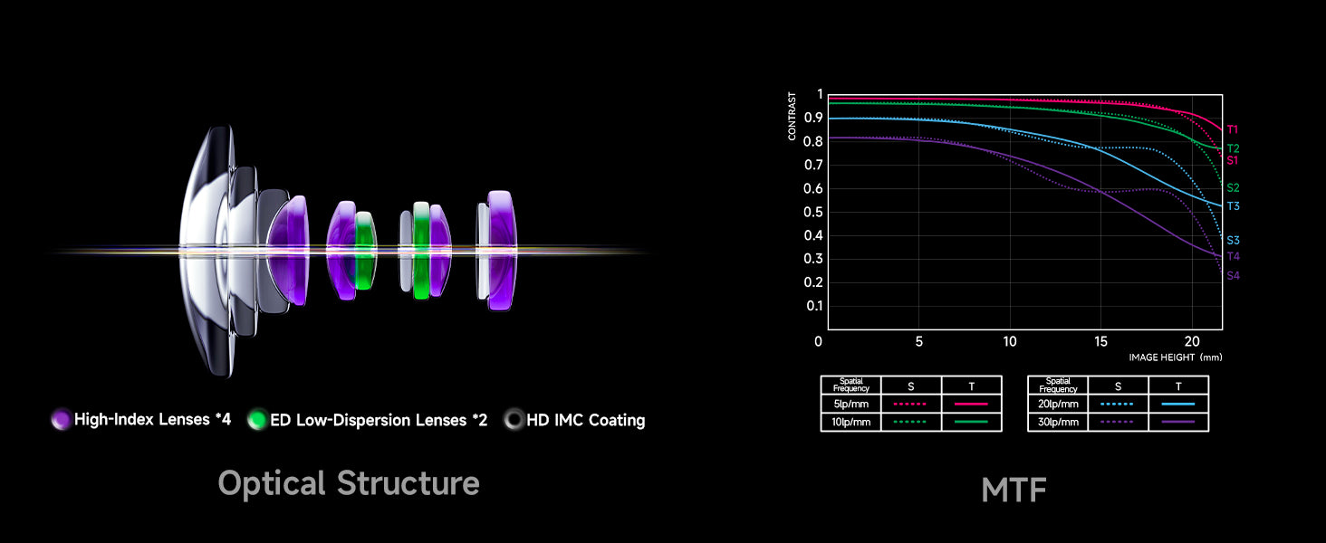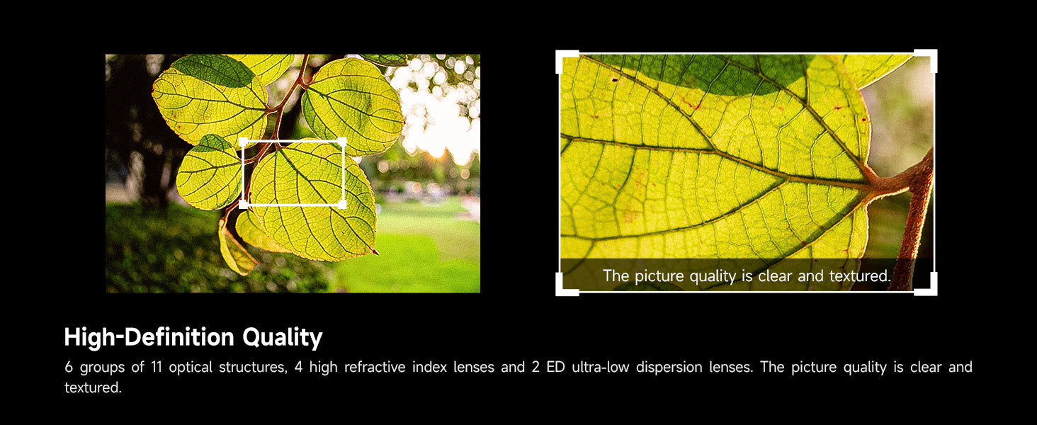 11 Elements in 6 Groups: 6 sets of 11 optical structures, 4 high refractive index lenses, and 2 ED lens, effectively control dispersion while ensuring sharpness, making the image clear and sharp from the center to the edges.