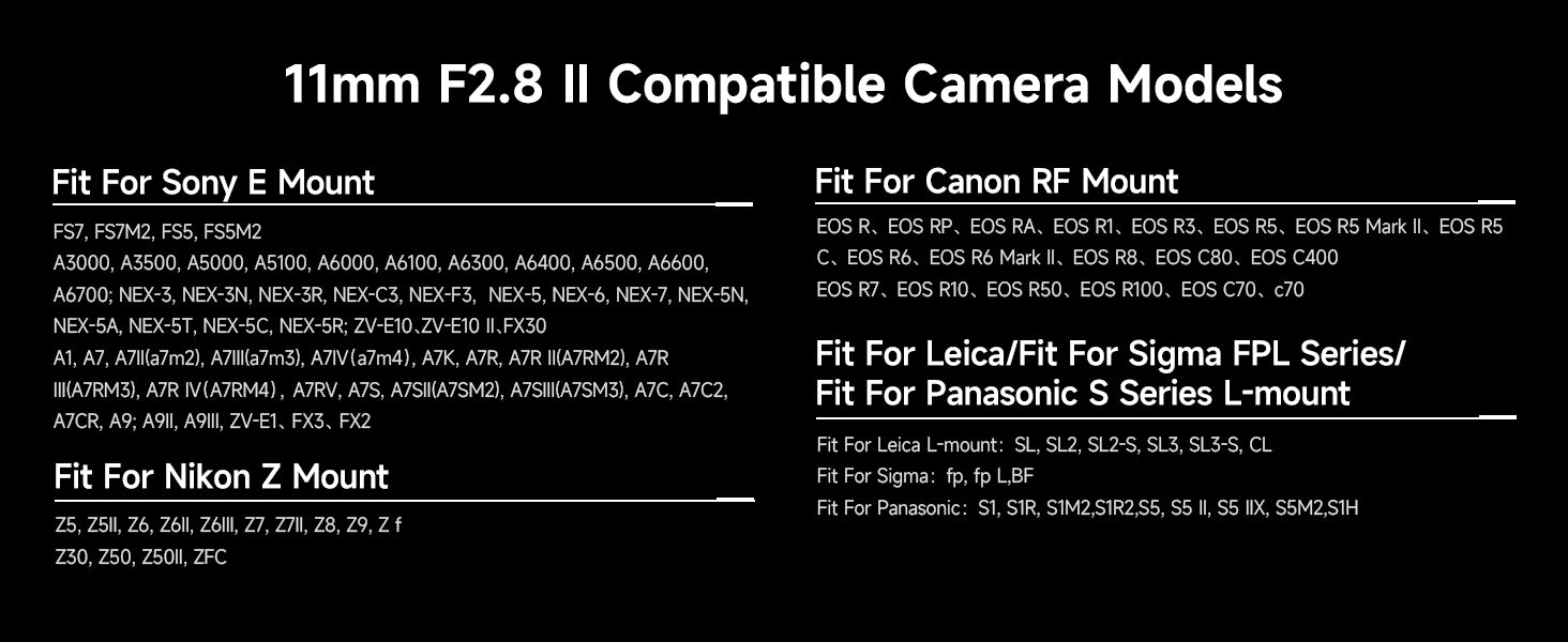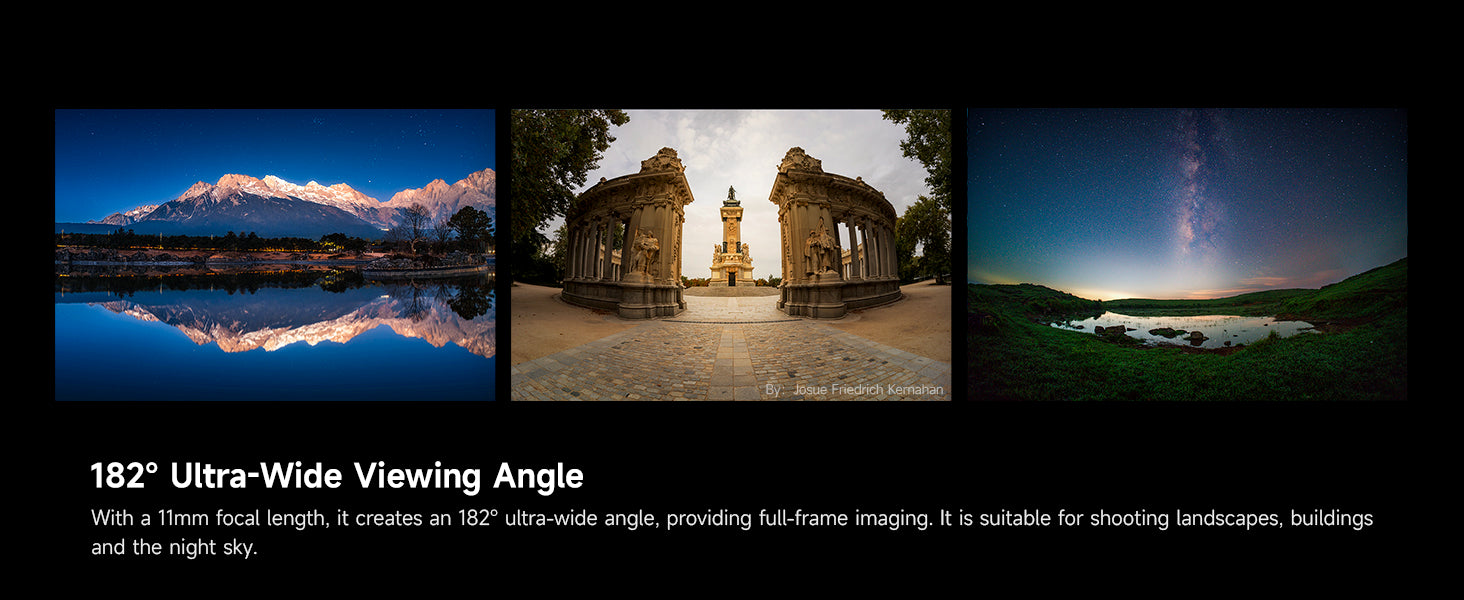 182° Ultra Wide Angle:Brightin Star 11mm F2.8 II features a 182° ultra-wide angle of view with full-frame uncropped imaging, ideal for landscape, architecture, and astrophotography.