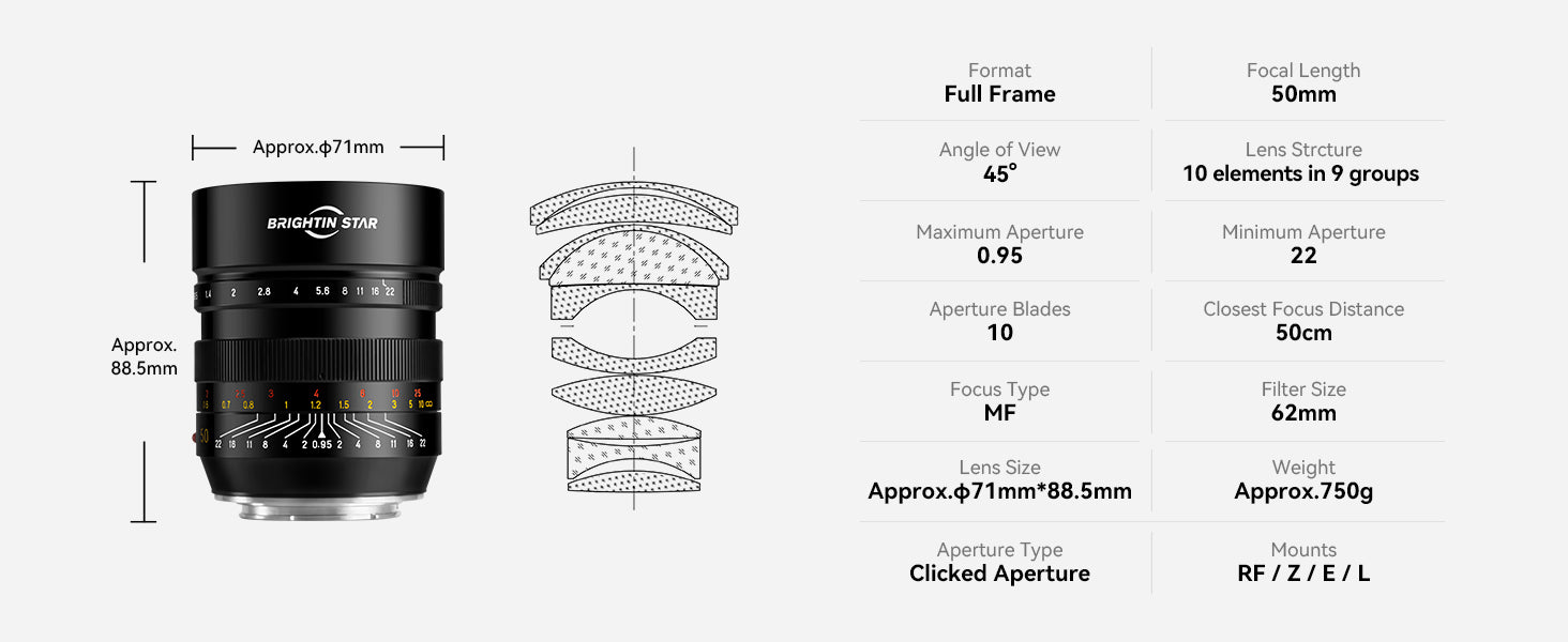Brightin Star | Full frameSize, weight: 71*95mm, 820gMount: Canon RF, Sony mount, L mount, Nikon ZScene: night scene, still life, food, portraitF0.95 super large aperture night scene portrait lens