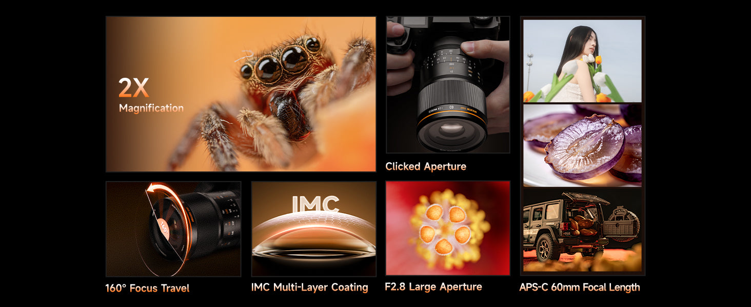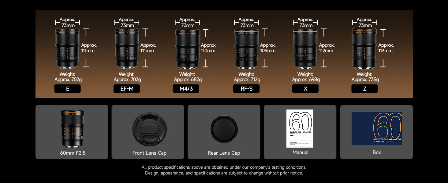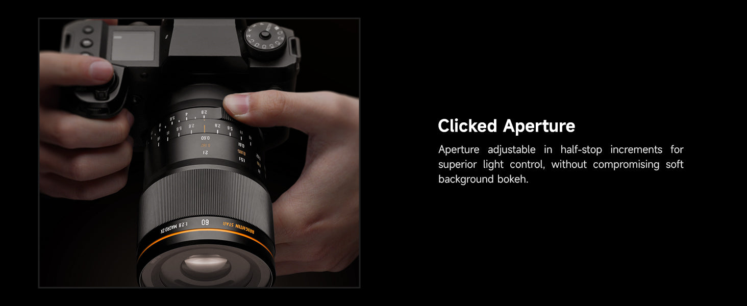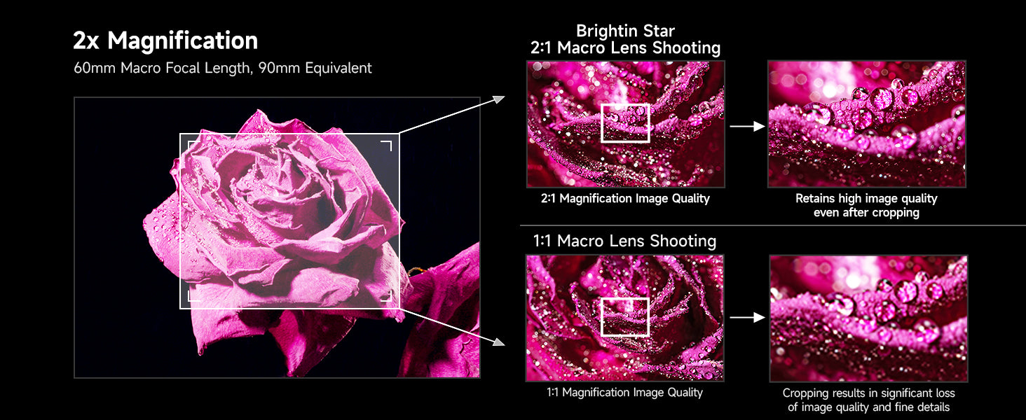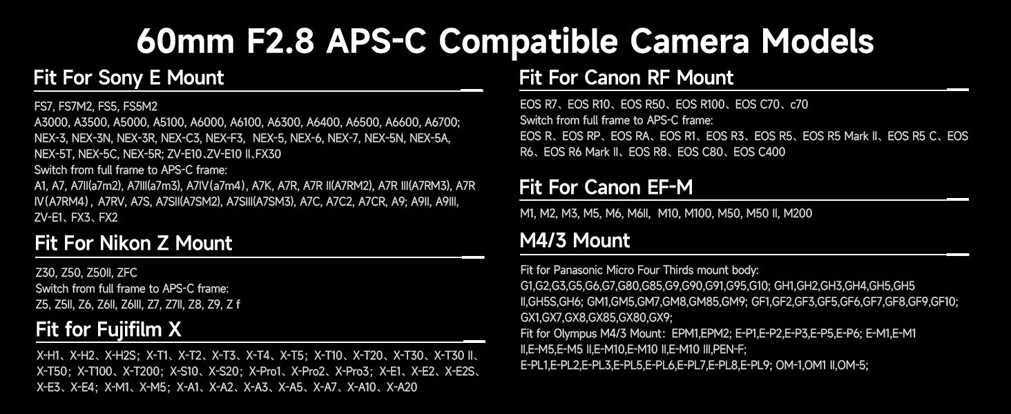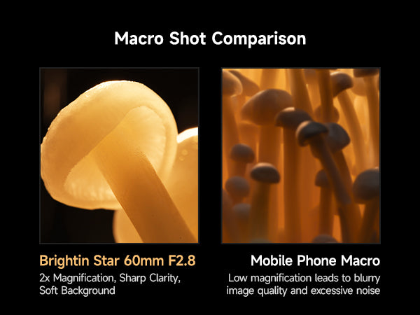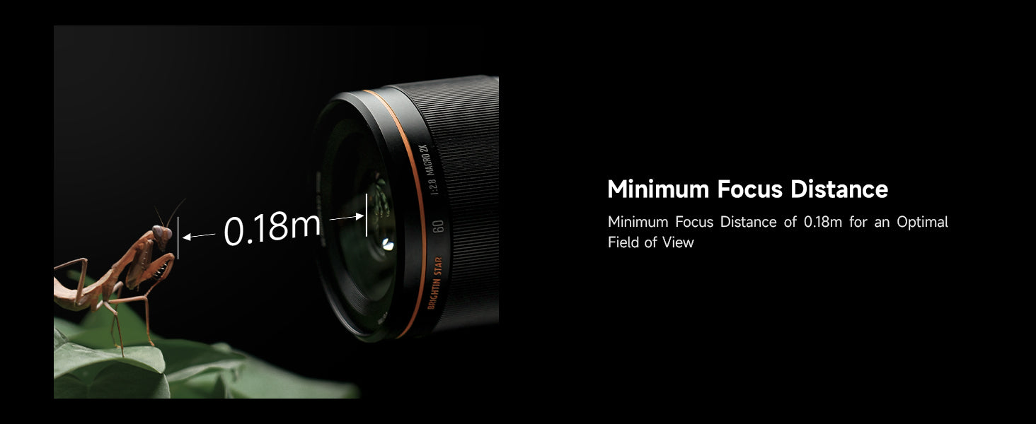Brightin Star | Full frameSize, weight: 73*112mm, 698gMount: E/ EF-M / M4/3 / RF-S / X / ZShooting Scenarios: Detailed portraits, Insects, Plants, PetsHidden Worlds Coming Alive[Attention Please]To provide you with the best shooting experience, please ensure you have READ and UNDERSTAND the information below before purchasing.This Brightin Star camera lens is designed exclusively for Mirrorless Cameras and is NOT compatible with SLR/DSLR cameras.[Note]This is a manual focus lens and does not include an autofocus function. Before use, make sure your camera is set to “Release Without Lens / Shoot Without Lens” mode—otherwise the camera may be unable to take photos or videos. If you need assistance, please contact our customer service team directly.2x Magnification: The Brightin Star MF 60mm F2.8 2X Macro Lens features 2x magnification, retaining sharp clarity even after cropping APS-C 60mm Focal Length:60mm Macro, 90mm Equiv. – Versatile for Multiple Shooting SubjectsF2.8 Large Aperture: Delivers clearer, brighter images in low-light conditions with softer background bokeh.Coating Technology: IMC Coating Technology effectively suppresses flare and chromatic aberration, ensuring pure, true-to-life images with accurate color reproduction.160° Focus Travel:Smooth focusing for effortless operation; long focus travel enables precise manual focus control.【Customer Support】We stand behind Brightin Star 60mm F2.8 APS-C Lens— 24-month warranty and friendly 24-hour responsive after-sales service.#BrightinStar #BrightinStar60mm #60mmF2.8 #2XMacro #MacroLens #2XMacroLens #60mmMacro #APSC macro lens #ManualFocusMacro #MirrorlessMacro #SonyEMountMacro #NikonZMacro #FujiXMacro #CanonRFMacro #M43Macro #CanonEFMMacro #90mmEquivalent #LargeApertureMacro #F2.8Macro #MacroPhotography #InsectPhotography #FlowerMacro #PlantMacro #PetPortrait #CloseUpLens #ManualFocusLens #BudgetMacroLens #AffordableMacro #2to1Macro #DoubleMagnification #MacroLensForSony #MacroLensForNikon #MacroLensForFuji #MacroLensForCanon #ExtremeMacro #DetailedPortrait #BokehMacro #LowLightMacro