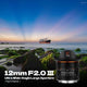 [Premium Design] The 12mm F2.0 III ultra-wide-angle large-aperture lens is equipped with an optical structure of 12 elements in 9 groups, including 2 aspherical lenses and two ED lenses. It uses a multi-layer coating process, the picture has very high sharpness from the center to the edges.